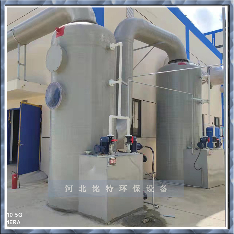 為濕法吸收型凈化設(shè)備,其功能設(shè)計(jì)為填料、噴淋分組分級(jí)式。當(dāng)處理廢氣為酸性時(shí),一般宜采用氫氧化鈉(NaOH)為吸收和液。當(dāng)處理廢氣為堿性時(shí),一般用中性或偏酸性水進(jìn)行洗滌。其工作原理為:廢氣由風(fēng)機(jī)壓入洗滌塔內(nèi)外向夾套組成的均壓室,通過(guò)勻格柵使廢氣勻速進(jìn)行一級(jí)填料功能段,進(jìn)行一級(jí)噴淋,使氣液二相得到一次充分接觸,經(jīng)一級(jí)處理后的廢氣用由漸擴(kuò)段減速進(jìn)入二級(jí)填料噴淋功能段,再使廢氣得到更充分的氣液二相接觸反應(yīng),然后再經(jīng)脫液器脫液除霧后,尾氣由排出口經(jīng)風(fēng)道排入大氣。
