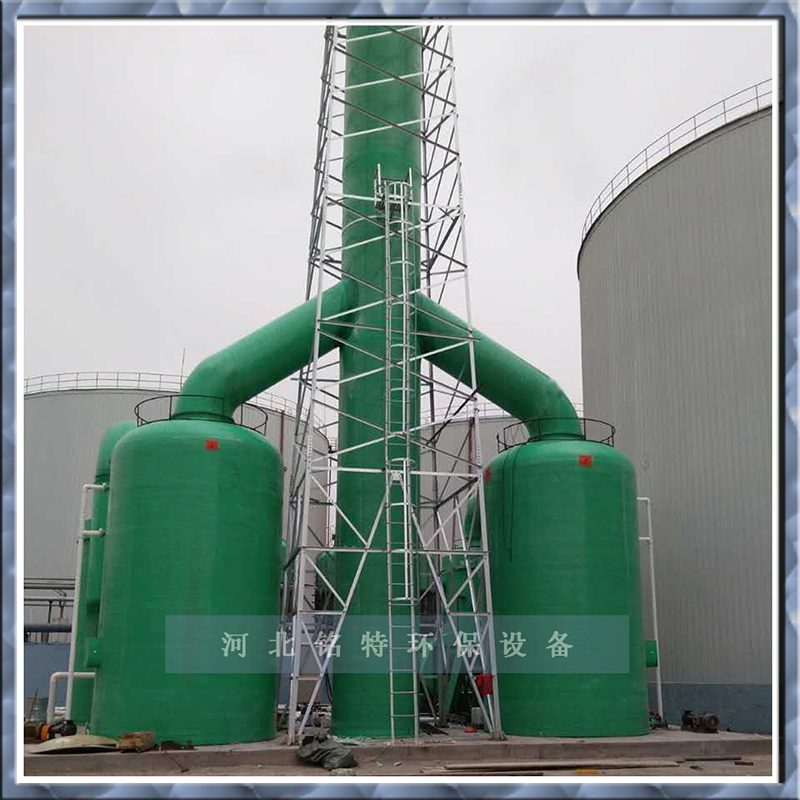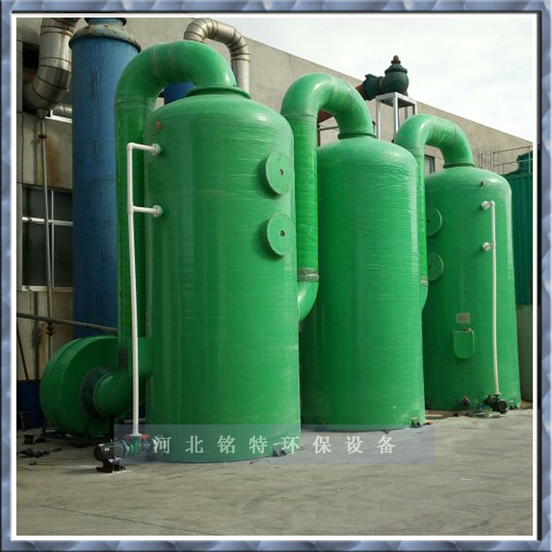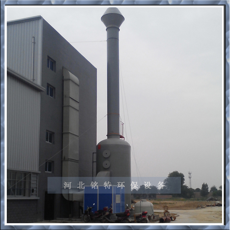 為濕法吸收型凈化設(shè)備,其功能設(shè)計為填料、噴淋分組分級式。當(dāng)處理廢氣為酸性時,一般宜采用氫氧化鈉(NaOH)為吸收和液。當(dāng)處理廢氣為堿性時,一般用中性或偏酸性水進行洗滌。其工作原理為:廢氣由風(fēng)機壓入洗滌塔內(nèi)外向夾套組成的均壓室,通過勻格柵使廢氣勻速進行一級填料功能段,進行一級噴淋,使氣液二相得到一次充分接觸,經(jīng)一級處理后的廢氣用由漸擴段減速進入二級填料噴淋功能段,再使廢氣得到更充分的氣液二相接觸反應(yīng),然后再經(jīng)脫液器脫液除霧后,尾氣由排出口經(jīng)風(fēng)道排入大氣。
