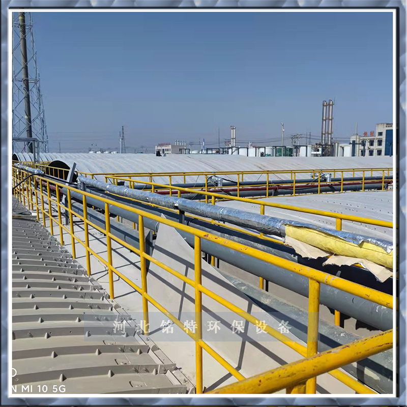 7、蓋板的兩側(cè)設(shè)置有向內(nèi)的導(dǎo)流板,高濕蒸發(fā)水份沿棚蓋流入兩側(cè)的導(dǎo)流板后,經(jīng)過表面的導(dǎo)流槽,再次流入污水池內(nèi),防止侵漬腐蝕池壁混凝土結(jié)構(gòu)。